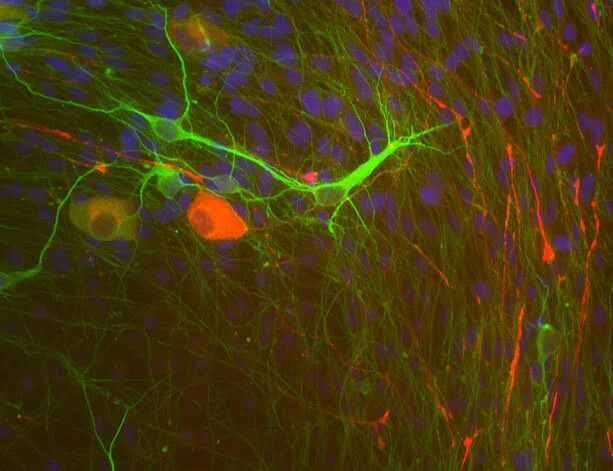 Anti-ß-Tubulin (green) stained cells innervated by Anti CGRP (Phosphosolutions) positive axons (red)